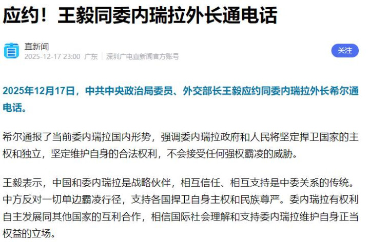 就在俄罗斯发出强硬警告的同时,中方也没闲着。王毅外长应约跟委内瑞拉外长希尔通了电话,看似是一次常规的外交沟通,实则是在关键节点亮明了中方的立场,给委内瑞拉送去了关键的支持。