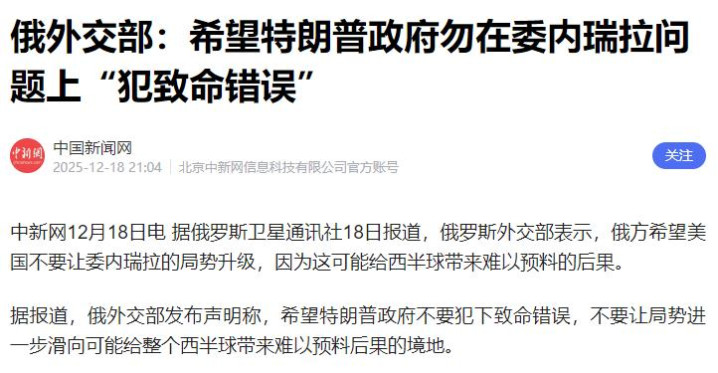 特朗普这边还在媒体上放狠话,说“不排除与委内瑞拉开战的可能性”,那边普京政府就直接把话挑明了,没有任何含糊。18号那天,俄罗斯外交部直接发了声明,措辞严厉得很,核心就一个意思:美国你在委内瑞拉问题上别犯致命错误,否则整个西半球都得跟着倒霉,承受不可预测的后果。这话听着是警告,实际上就是给特朗普下的最后通牒——你可以对委内瑞拉施压,但想动马杜罗,门都没有。